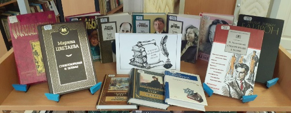 Для читателей библиотеки оформлена выставка сборников стихов известных поэтов: М. Цветаева, В. Маяковский, О. Мандельштам, Ю. Друнина, Н. Гумилев и Л. Рубальская, А Дементьев, А. Блок, А. Фет,  Т.  Снежина.