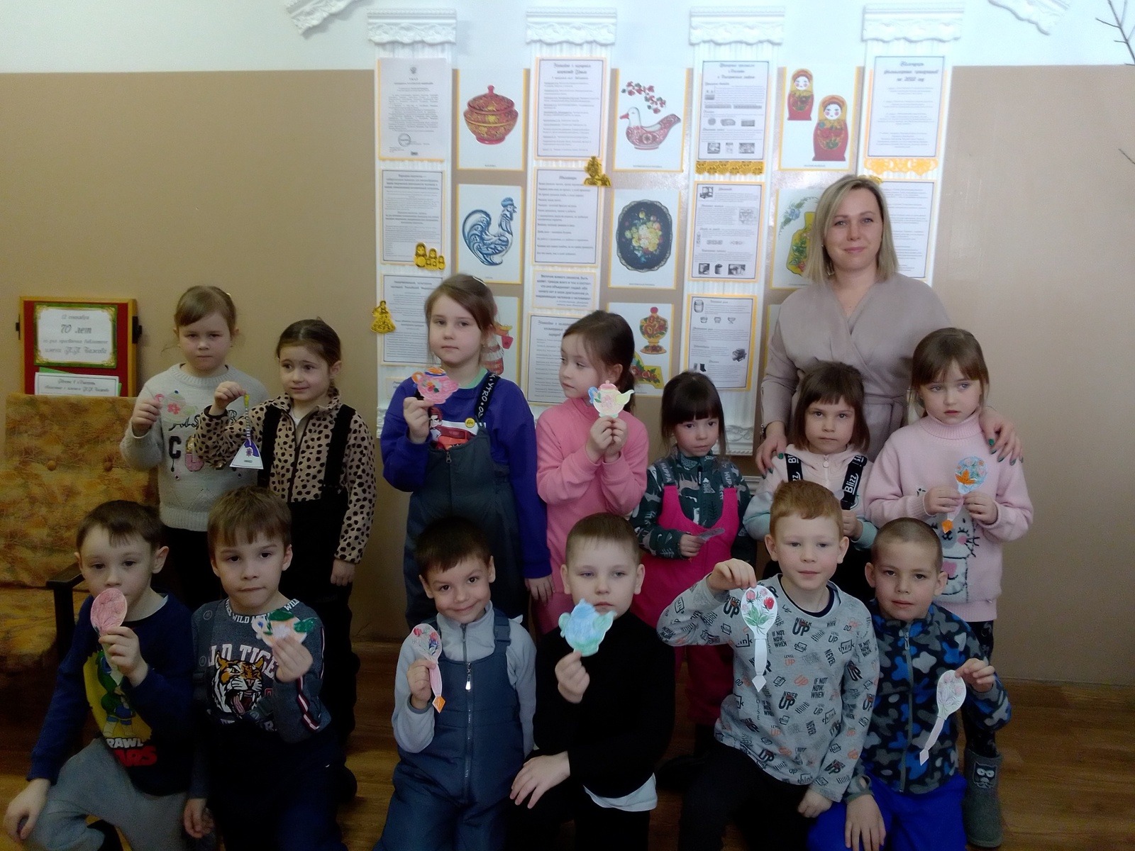 2022 год – объявлен Годом народного искусства и нематериального культурного наследия. Россия испокон веков славится мастерами, способными своими руками создавать и творить настоящую красоту. Народные промыслы – это именно то, что делает нашу культуру богатой и неповторимой. О самых ярких из них ребята узнали на игровой программе «Русские народные промыслы». Участники мероприятия отгадывали загадки про дымковскую и филимоновскую игрушку, хохлому, каслинское литье. Собирали пазлы и кубики, цветными карандашами и фломастерами разукрасили матрешку, сматывали на скорость нитки в клубок. Дружно разгадали филворд и кроссворд. Наряжались в костюмы и танцевали под веселые народные песни. В ходе мероприятия дети побывали в роли настоящих мастеров и с удовольствием разрисовали подготовленные бумажные шаблоны: балалайки, деревянные ложки и чайник.