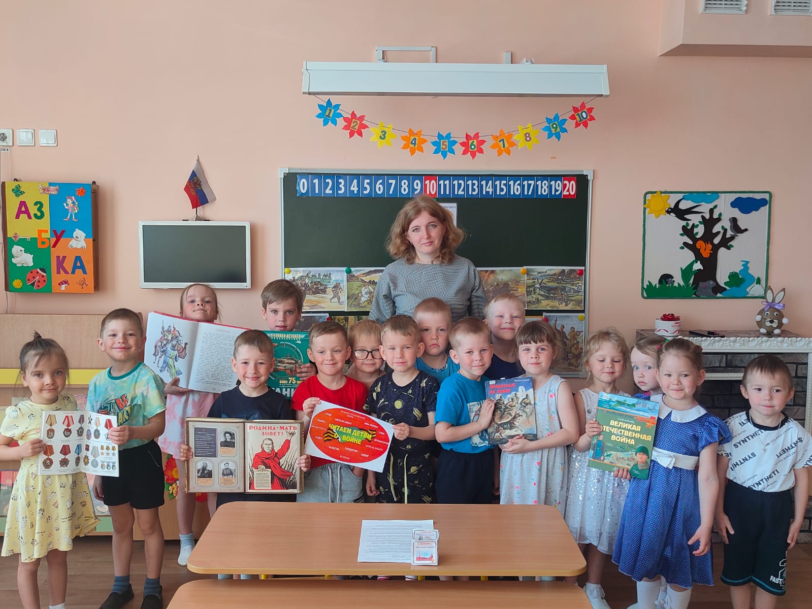 Ведущая познакомила детей с книгой Феликса Семяновского «Повесть о фронтовом детстве». Ребята узнали о том, что осенью 1941 года мальчик Федя должен был пойти в первый класс, однако война распорядилась иначе. Семью осиротевшему мальчику заменили разведчики, учиться грамоте пришлось в перерывах между боями. Маленький отважный «фронтовичок» с честью выдержал все тяготы войны и совершил не один взрослый подвиг. Ведущая познакомила и с другими книгами о детях во время войны: М. Ефетов «Последний снаряд», С. Олефир «Когда я был маленьким, у нас была война», Ю. Яковлев «Как Серёжа на войну ходил», «Друг капитана Гастелло». Дети ответили на вопросы викторины «Писатели – фронтовики».