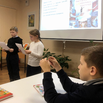 С веселого знакомства — путаницы началась литературная игра «Папы разные нужны, папы разные важны» у четвероклассников школы № 23. Ребята познакомились с книгами о папах, с рассказами Александра Раскина «Игра в путаницу», «Как папа обманывал учительницу». Ответили на все вопросы викторины и нарисовали открытку для пап.