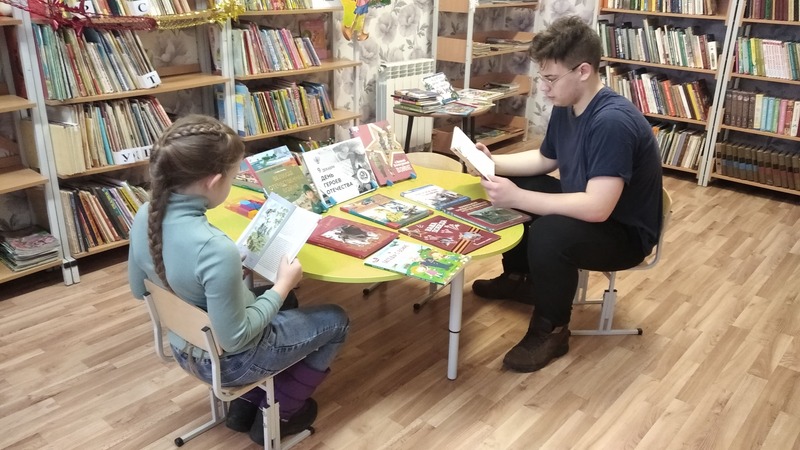 Юные читатели познакомились с историей возникновения праздника, который напрямую связан с учреждением ордена Святого Георгия Победоносца. Узнали имена славных героев-орденоносцев со времен Отечественной войны 1812 г., Первой мировой войны, Великой Отечественной войны 1941–1945 гг. А также и о героях нашего времени – познакомились с именами уже современных героев Чеченской и Афганской войн нашего округа, героями СВО. Мероприятие сопровождалось видеопрезентацией «Герои Отечества». Проведены игры «Назови автора книги о герое», «Подвиг в книгах». Ведущая познакомила с книжной выставкой «День героев Отечества», где представлены произведения: «Детям о Великой Отечественной войне», «Рассказы о юных героях», Р. Погодин «Живи, солдат», Л. Кассиль «Рассказы о войне», «Линия связи», Ю. Яковлев «Как Серёжа на войну ходил».