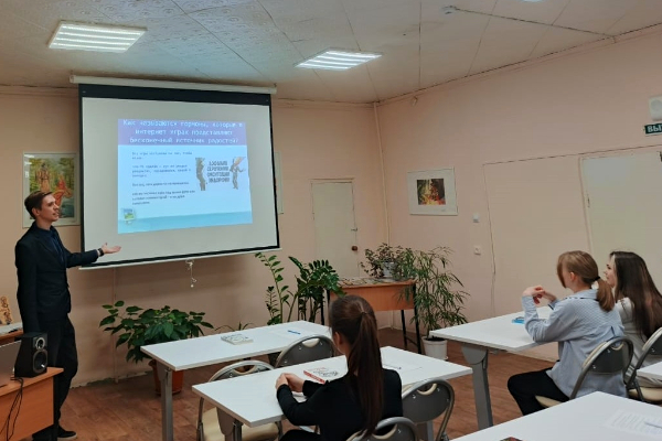 В рамках акции прошла встреча с преподавателем информатики МАОУ ВСОШ А.Г. Годлевским. Андрей Григорьевич познакомил присутствующих с причинами киберзависимости среди подростков и молодежи. Старшеклассники разобрали возможные последствия не осознанного веб-серфинга в безбрежном океане интернета и неразумного использования гаджетов. Оказывается, человек, находясь в виртуальной реальности, испытывает постоянное чувство тревоги, озлобленности и страха. Теряя контроль над собой в реальном мире, он рискует причинить вред не только себе, но и окружающим.