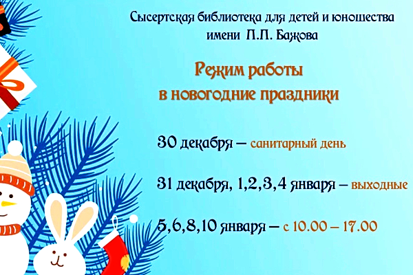 Обратите внимание на режим работы Сысертской библиотеки для детей и юношества имени П. П. Бажова в новогодние праздники: