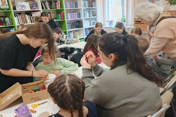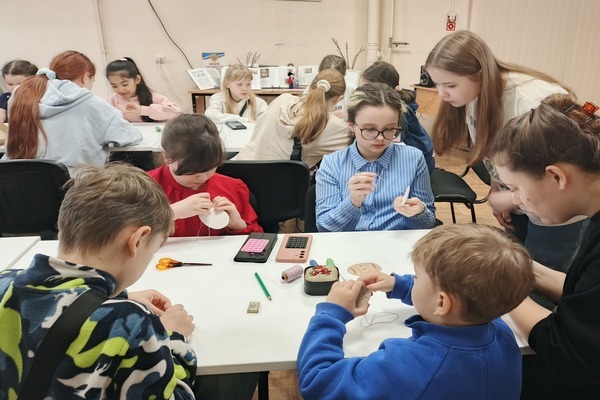 На мастер-классе дети учились технике изонить, вышивали нитками узоры на шаблонах в форме яиц, а затем превращали свои творения в пасхальные открытки, приклеивая на картон.